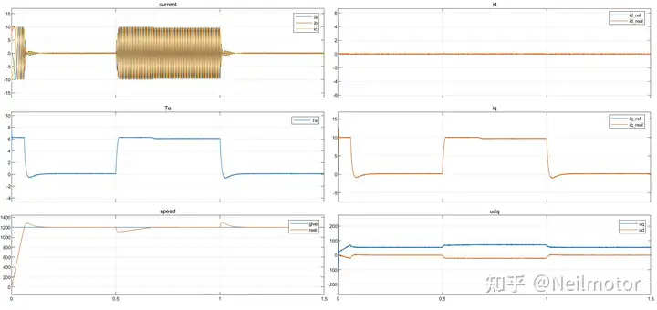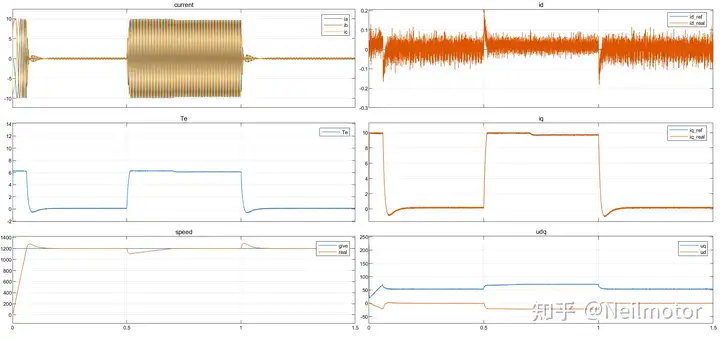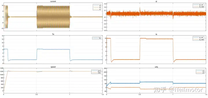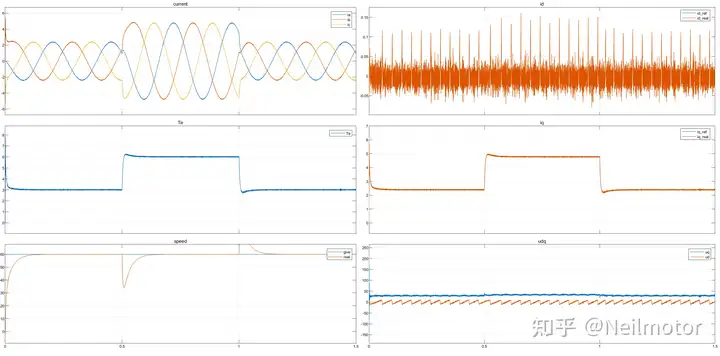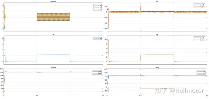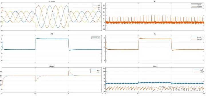 电机控制性能依旧很好,在加载时电机转速恢复较慢,是由于dq轴电流已达到限幅值,有需要的小伙伴可以将该值设置大一些或者按照实物设置。