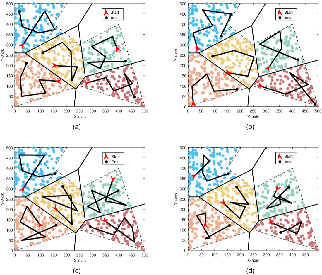 利用覆盖半径估算所需无人机数量,并通过 K-means 聚类确定种子点位置,结合 Voronoi 图将不规则灾区划分为多个互不重叠的子区域,使每架无人机负责一个子区域,从而实现空间解耦与分布式任务执行。各无人机从统一起点出发,按距离子区域质心远近顺序错时部署,以降低碰撞风险。子区域内通过聚类确定目标悬停点,并进行路径规划。