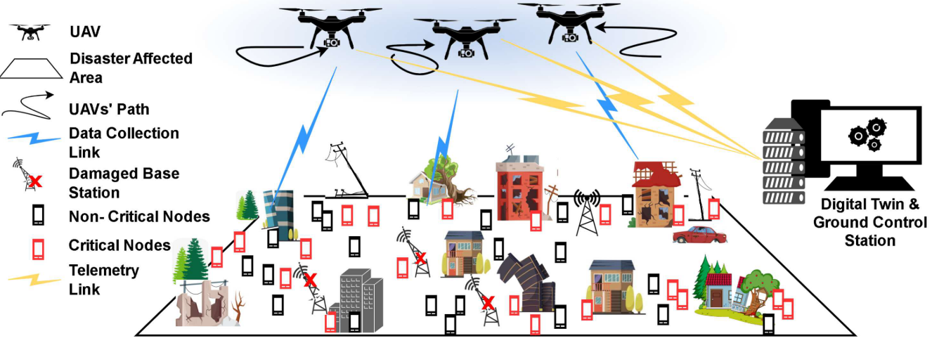 灾害区域内随机分布 N N N个地面源设备 (OSDs),其中关键节点 (CNs)数量为 N C N ⊆ N N_{CN}\subseteq N NCN⊆N。部署 M M M架无人机在固定高度 H H H作为空中基站进行数据采集,通过区域划分避免无人机间干扰。