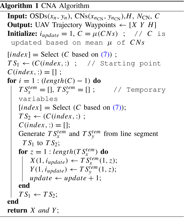 针对灾害场景下无人机辅助应急通信网络中的关键节点(CNs)覆盖问题,本文提出了一种距离优化的关键节点感知(CNA)轨迹规划方法。为提高数据采集的时效性,采用信息时效(AoI)作为性能指标;结合Voronoi图分区与K-means聚类实现节点分布感知的空间划分,确保无人机集群的无碰撞路径规划。通过标量化方法优化轨迹,在最大化关键节点覆盖率的同时最小化AoI、飞行距离和总飞行时间。