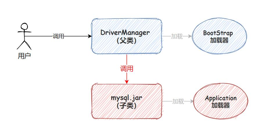 这样⼀来就破坏了双亲委派模型,因为DriverManager位于rt.jar包,由BootStrap类加载器加载, ⽽其Driver接⼝的实现类是位于服务商提供的Jar包中,是由⼦类加载器(线程上下⽂加载器 Thread.currentThread().getContextClassLoader)来加载的,这样就破坏了双亲委派模型了(双亲 委派模型讲的是所有类都应该交给⽗类来加载,但JDBC显然并不能这样实现)。它的交互流程图如 下所⽰: