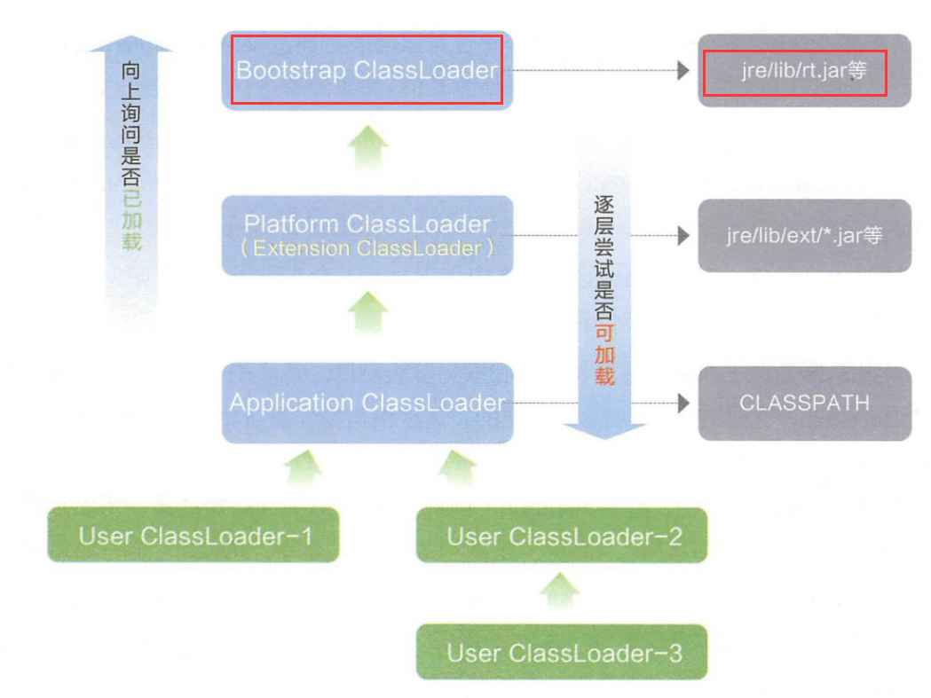 由双亲委派模型的加载流程可知rt.jar是有顶级⽗类BootstrapClassLoader加载的,如下图所⽰: