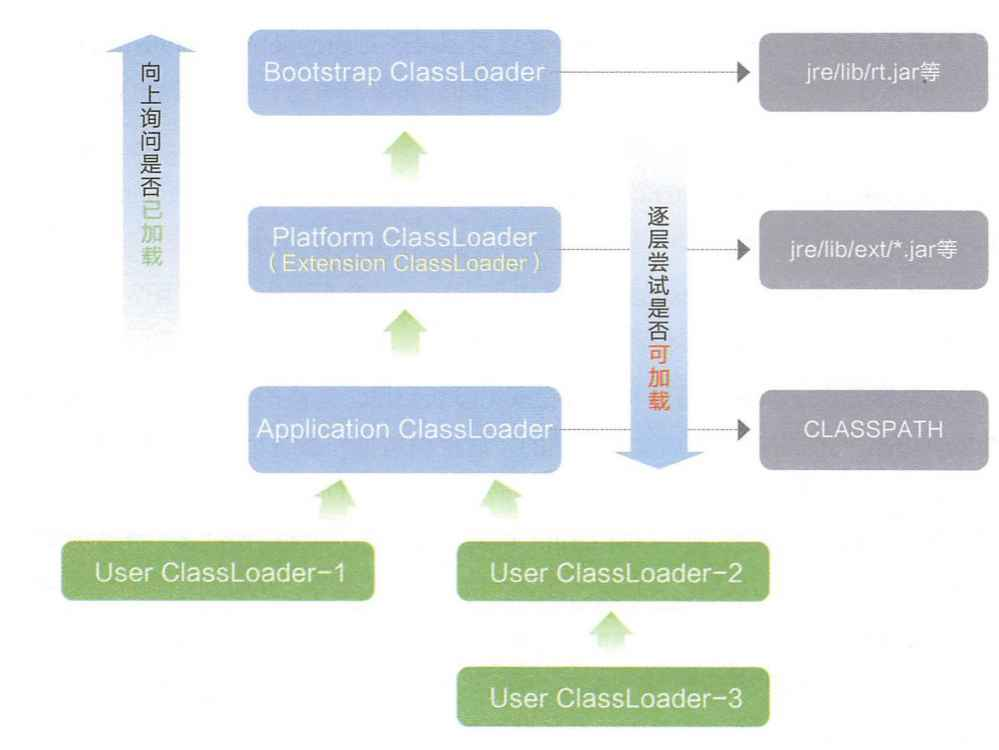 如果⼀个类加载器收到了类加载的请求,它⾸先不会⾃⼰去尝试加载这个类,⽽是把这个请求委派给 ⽗类加载器去完成,每⼀个层次的类加载器都是如此,因此所有的加载请求最终都应该传送到最顶层 的启动类加载器中,只有当⽗加载器反馈⾃⼰⽆法完成这个加载请求(它的搜索范围中没有找到所需 的类)时,⼦加载器才会尝试⾃⼰去完成加载。