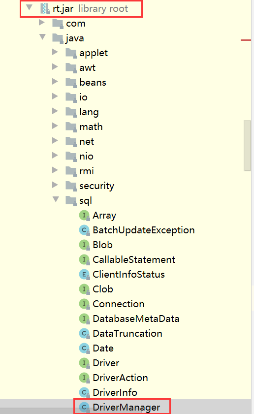 然后我们进⼊DriverManager的源码类就会发现它是存在系统的rt.jar中的,如下图所⽰: