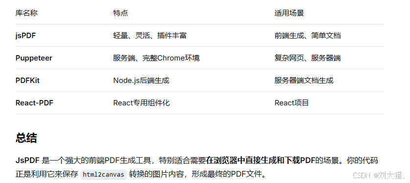 JsPDF 是一个流行的、纯 JavaScript 编写的开源库,用于在浏览器中生成 PDF 文档。