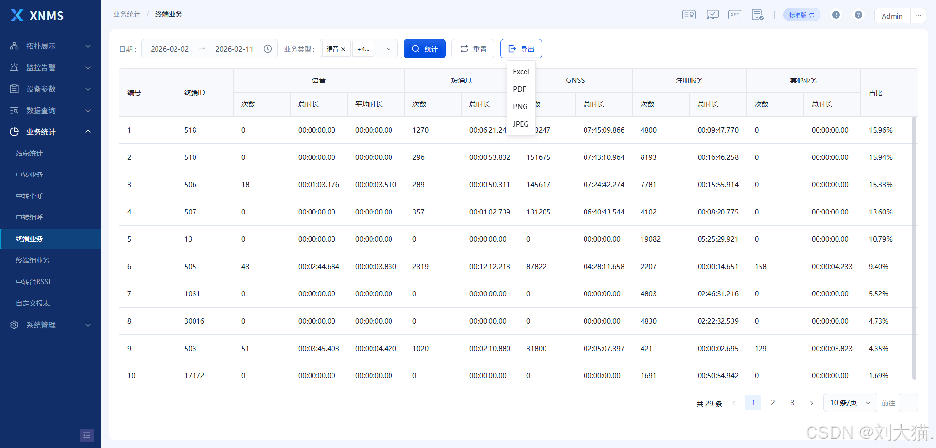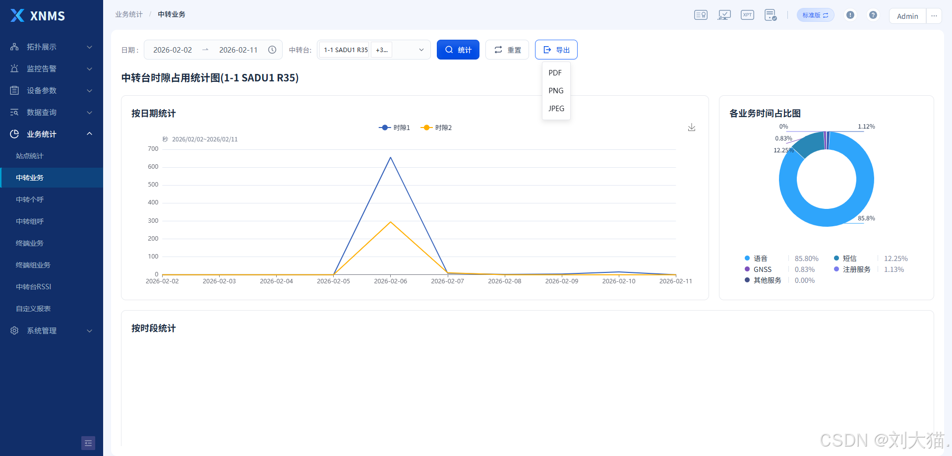 通过XNMS软件,工作人员可实时监控常规中转台的各项参数和告警情况,对异常问题进行排查;还可以查询或统计某时间段内中转台或终端的业务,从而全面了解常规系统的运行状况。