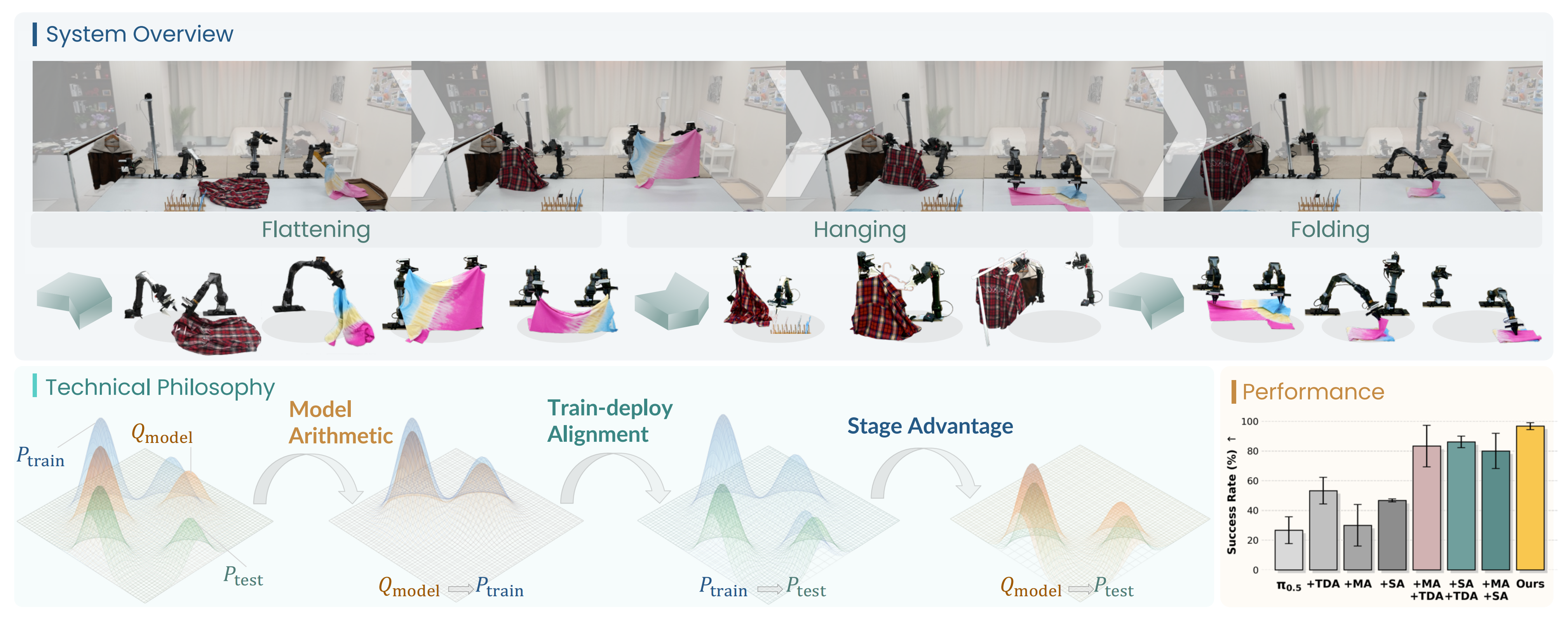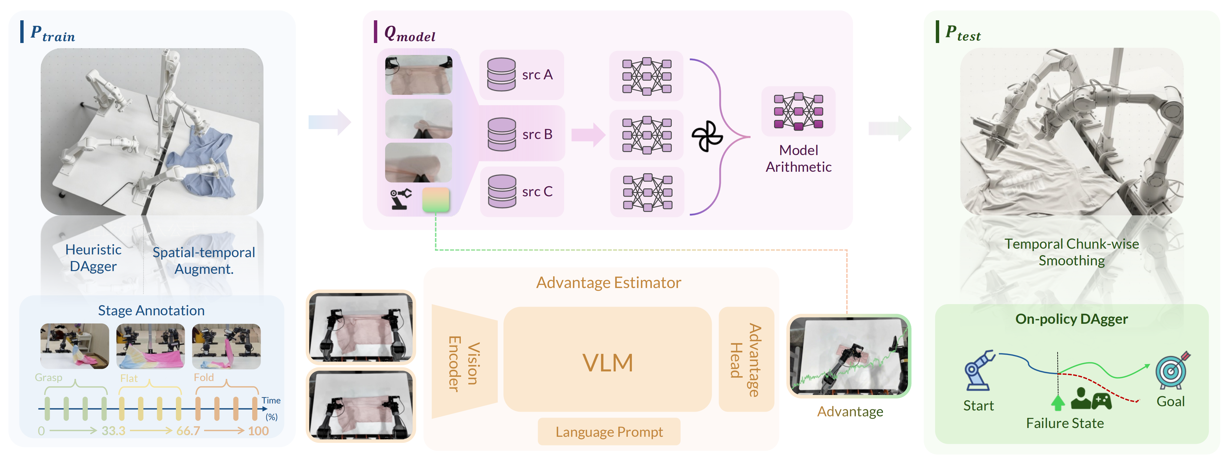 然而,χ0的作者指出,真实世界鲁棒性的首要瓶颈并不仅仅在于资源规模,而在于人类示范分布、策略所学习到的归纳偏置、以及测试时执行分布三者之间的分布偏移------这是一种系统性不一致性,会在多阶段任务中引发误差的级联累积 - χ0提出了一个Model Arithmetic,一种在权重空间进行融合的策略,可高效吸收不同示范所对应的多样化分布,范围从物体外观到状态变化