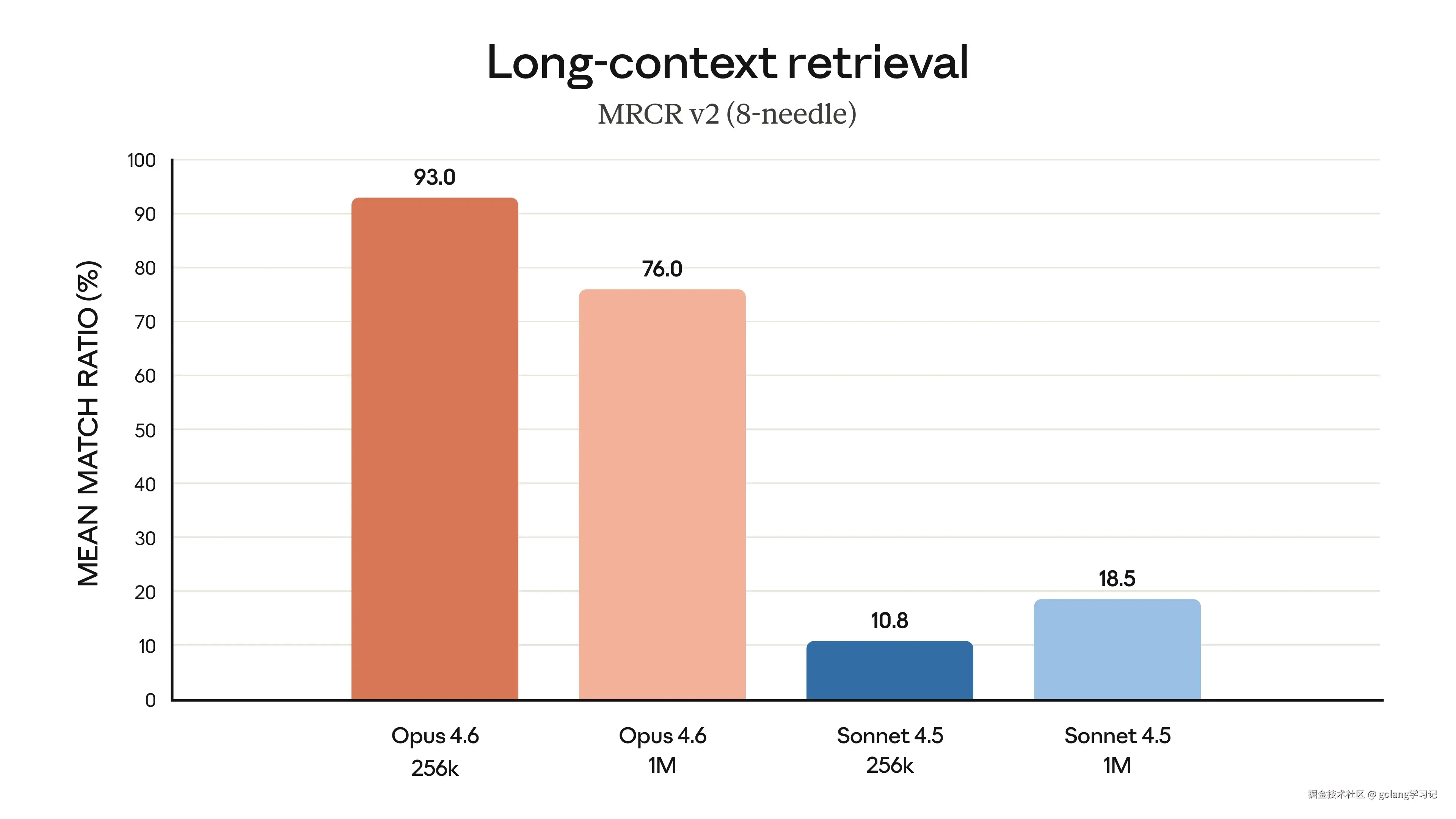 关键突破 :在 8-needle 1M 基准测试中,Opus 4.6 达到 76% 准确率,而 Opus 4.5 仅为 18.5% [[17]]。这意味着模型真正具备了在超长文本中精准定位关键信息的能力。