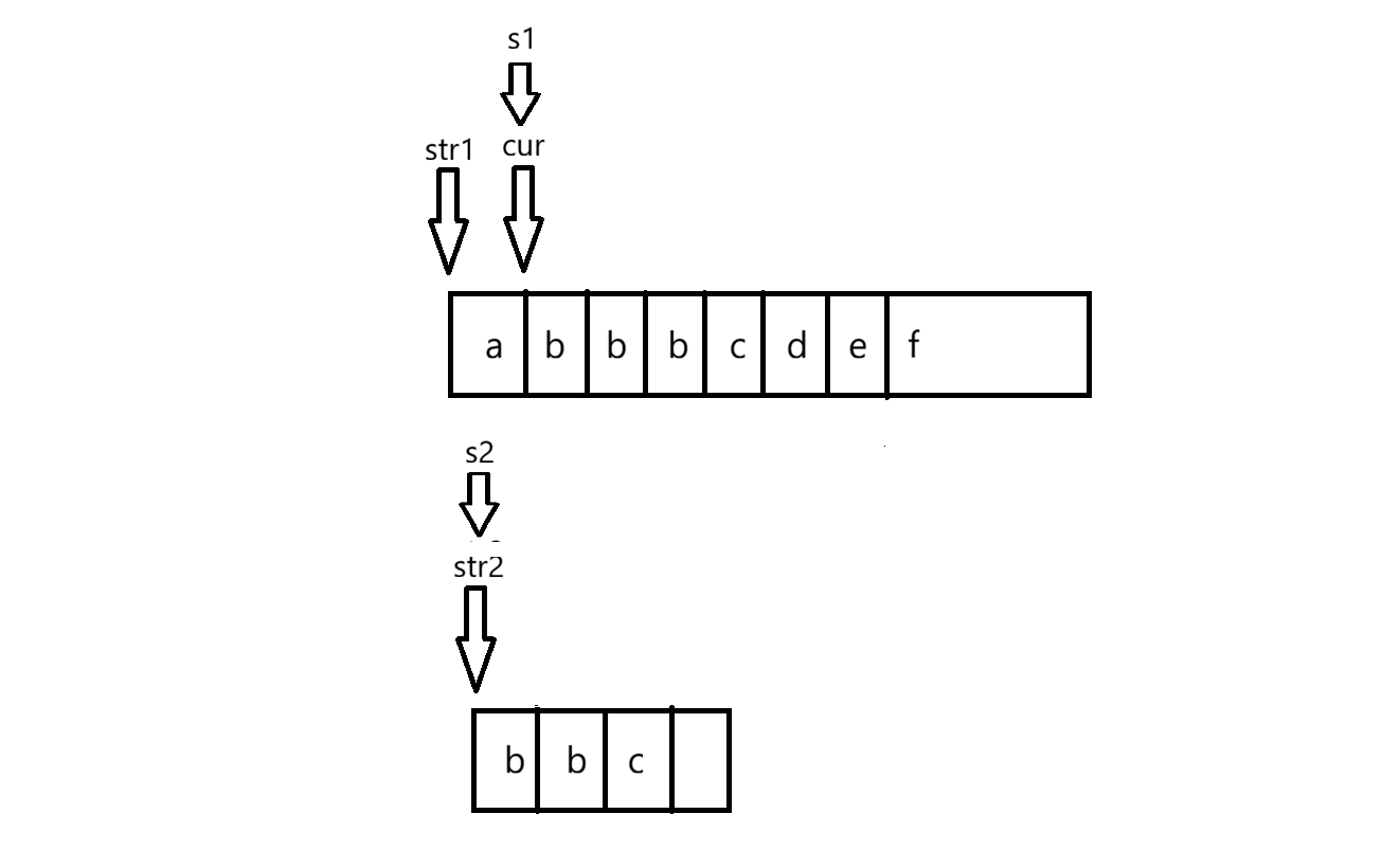 str1、str2分别记录字符串a、b的起始位置;cur记录比较的起始位置;s1、s2用于遍历,完成一次比较后分别靠cur、str2复位。