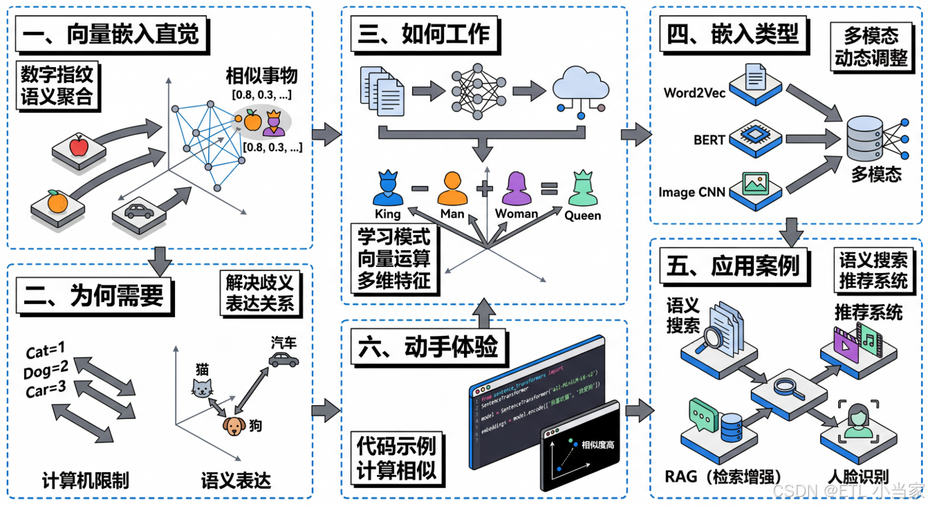 向量嵌入解决了这个问题。 通过多个维度的数字组合,它能表达出"猫和狗都是动物"、"国王和王后都是皇室成员"这样的语义关系。更神奇的是,这些向量还能进行数学运算,帮助机器理解类比关系。