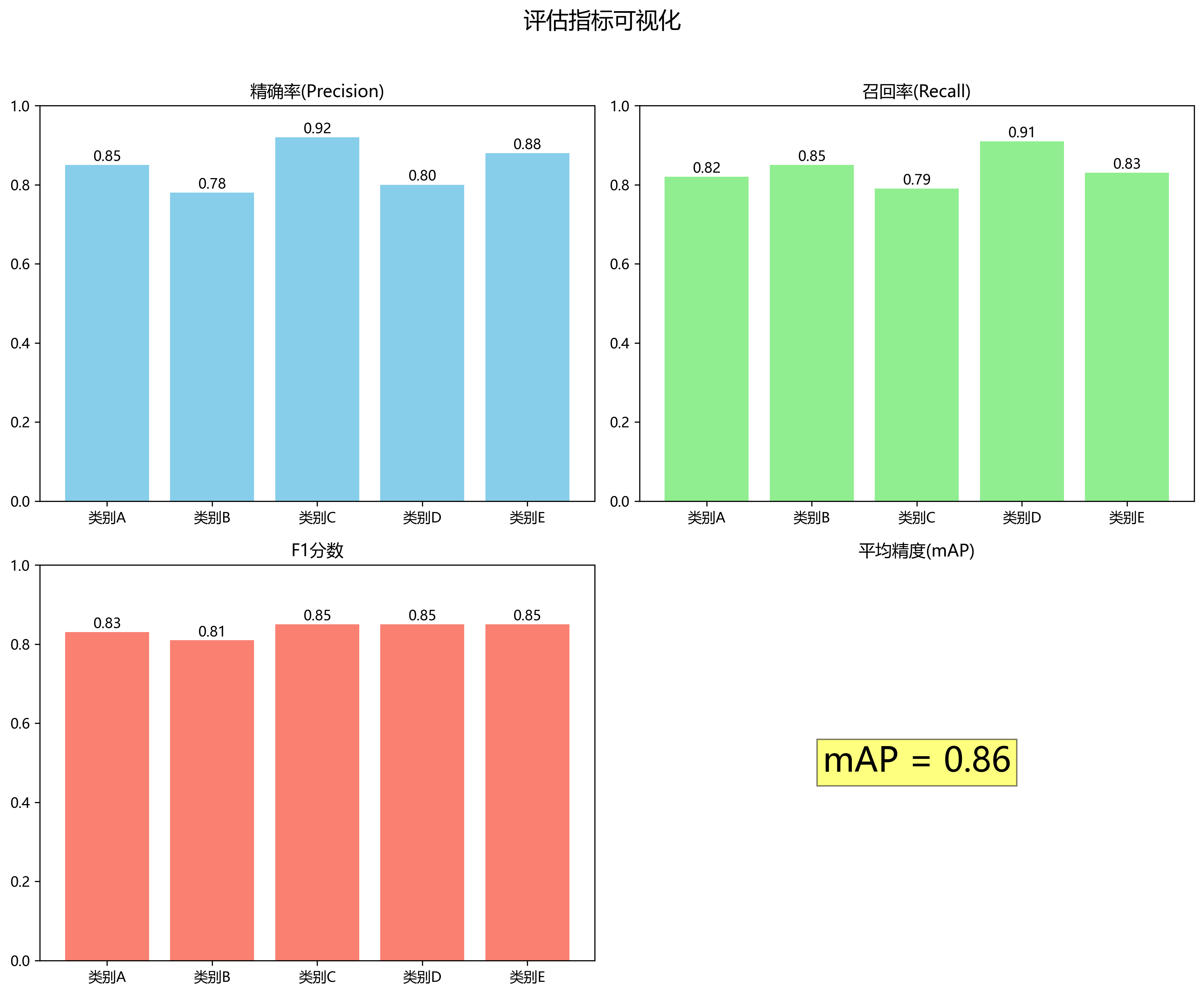 这些指标从不同角度反映了模型的性能。准确率反映了整体分类正确性,精确率和召回率则分别关注了假阳性和假阴性,F1分数平衡了两者,mAP则是目标检测领域的标准评价指标。通过综合分析这些指标,我们可以全面了解模型的优缺点。📊