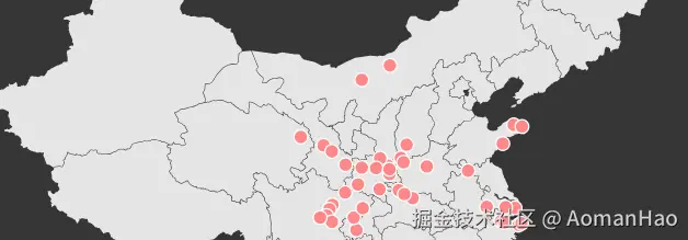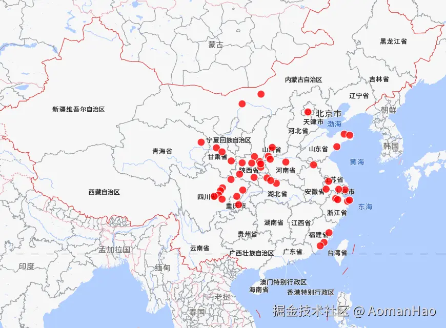 制作最基础的旅行足迹地图,显示效果见下图,可以查看下面的 Demo 演示,显示标记地点的名称和经纬度,并在地图上用红点显示