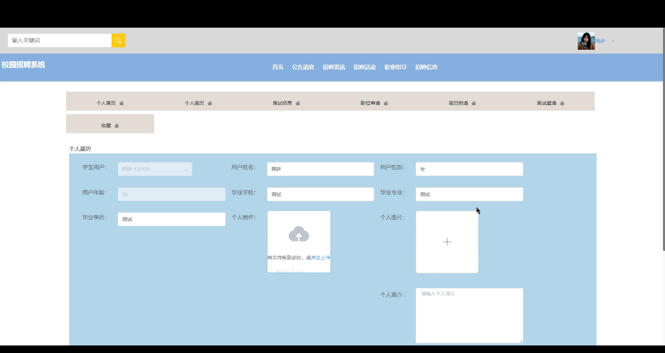 个人简历:填写和管理个人简历信息,包括用户姓名、性别、年龄、毕业学校、专业、学历、个人附件、个人图片、个人简介、审核状态等详细内容。界面如下图所示。