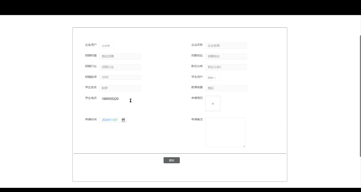 职位申请:浏览并申请感兴趣的职位,填写企业用户、企业名称、招聘标题、招聘地址、招聘行业、职业分类、招聘薪资、学生用户、教育背景、学生电话、申请简历、申请时间、申请备注等信息,并提交申请。界面如下图所示。