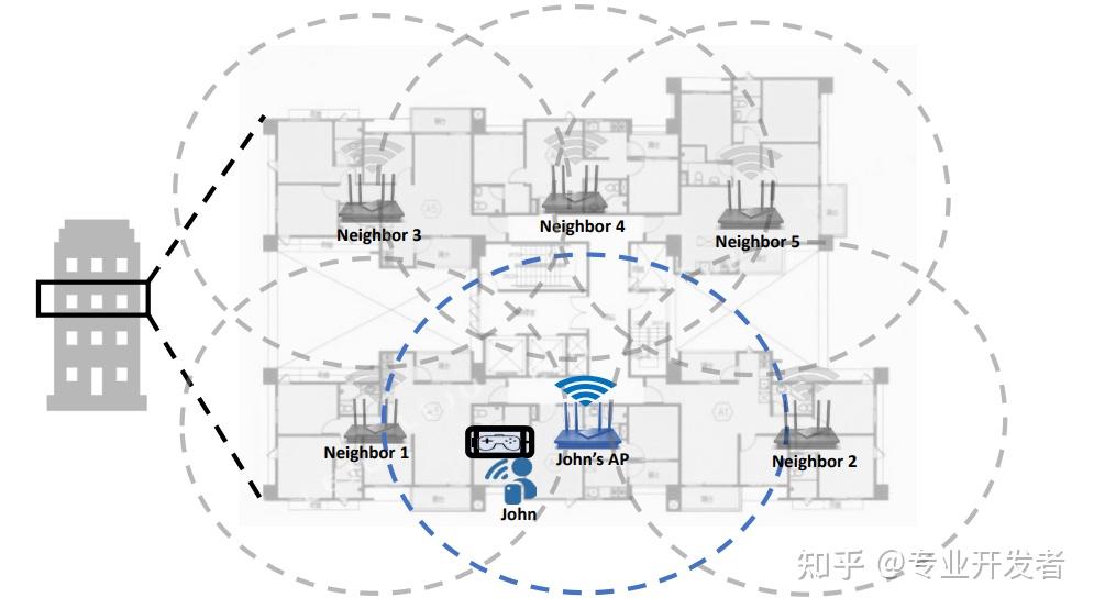 约翰住在一栋每层 6 户的公寓楼里,如图 1 所示。他的小公寓仅由一个 Wi-Fi AP 覆盖,但他能轻易搜到邻居家的 AP 信号。由于他所在的国家仅允许 2.4GHz 和 5GHz 频段用于 Wi-Fi,约翰和邻居们很可能使用重叠的频段,从而引发信号干扰。