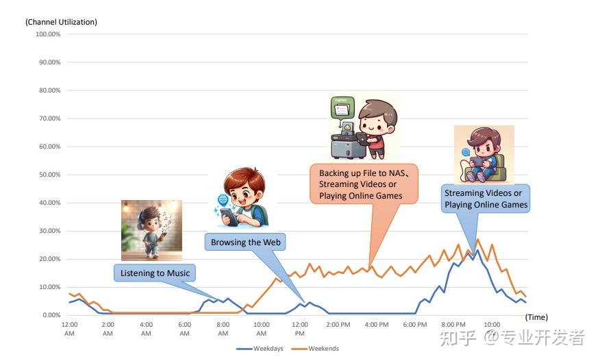 周末(橙线):约翰的上网时间从上午 10 点持续到晚上 11 点,且使用时长更长。他会花更多时间进行照片和视频备份到 NAS 等 Wi-Fi 活动,因此利用率高于工作日。