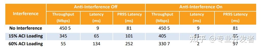 通过调整 ACI 负载,我们模拟了邻居 Wi-Fi 对约翰家的不同干扰程度。同时测试了文件下载与视频会议应用,结果总结于表 2。