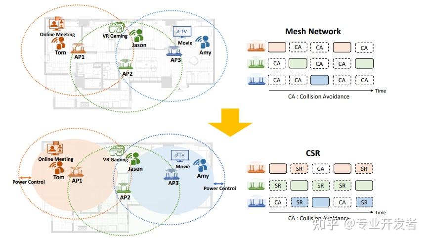 - 协同空间复用(CSR):专为 Mesh 网络的多 AP 场景设计,它通过发射功率控制机制实现 AP 间协同,显著增加每个路由器的可用空口时间、减少干扰,并提升 Mesh 网络内的传输机会。
