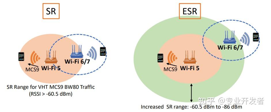 - 增强型空间复用(ESR):旨在增强单 AP 场景下的空间复用能力。该技术通过 PHY 载荷解码能力,在中远距离区分跨 BSS 的传统 Wi-Fi 信号,从而提升抗干扰性能。