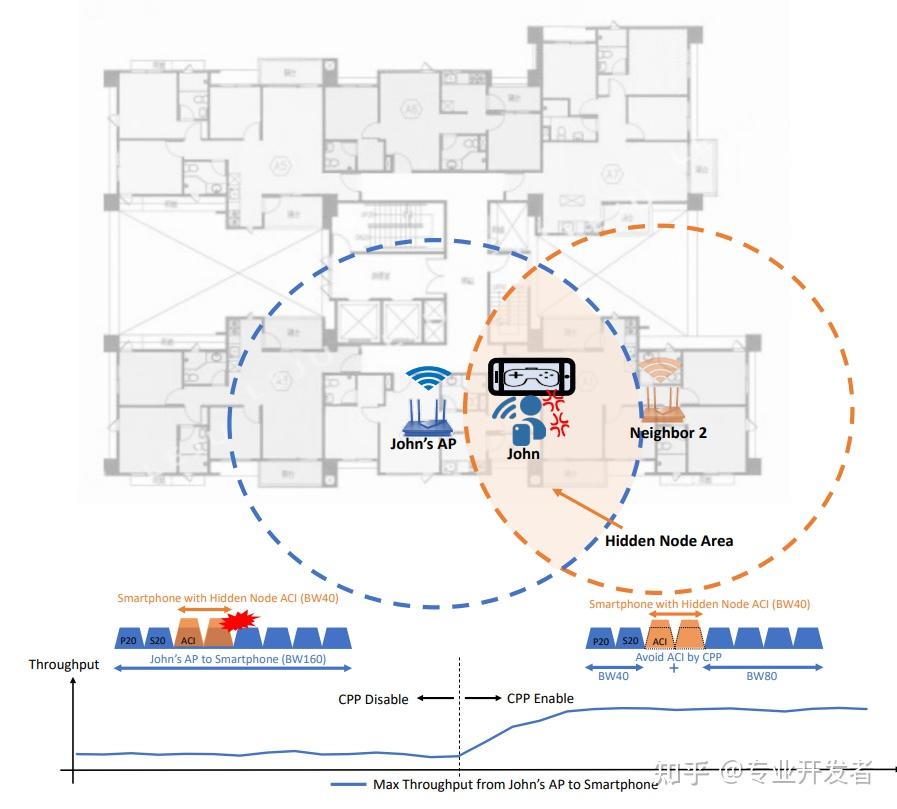 以之前讨论的单 AP 网络场景为例(图 7),约翰的 AP 无法感知到邻居 1 的干扰。当约翰移动手机到靠近邻居的位置时,就会触发隐藏节点场景,受到邻居 Wi-Fi 的干扰。