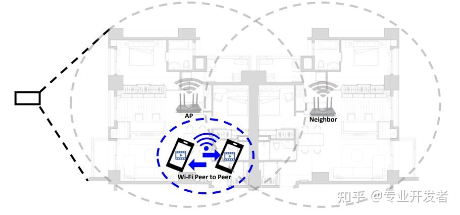 挑战:用户需要在客户端之间灵活创建临时点对点网络,但这些应用必须应对现有家庭 AP 路由器和相邻 Wi-Fi 路由器的信号干扰。如何让永久网络与临时网络共存,并确保它们的设备互不干扰,是核心挑战。