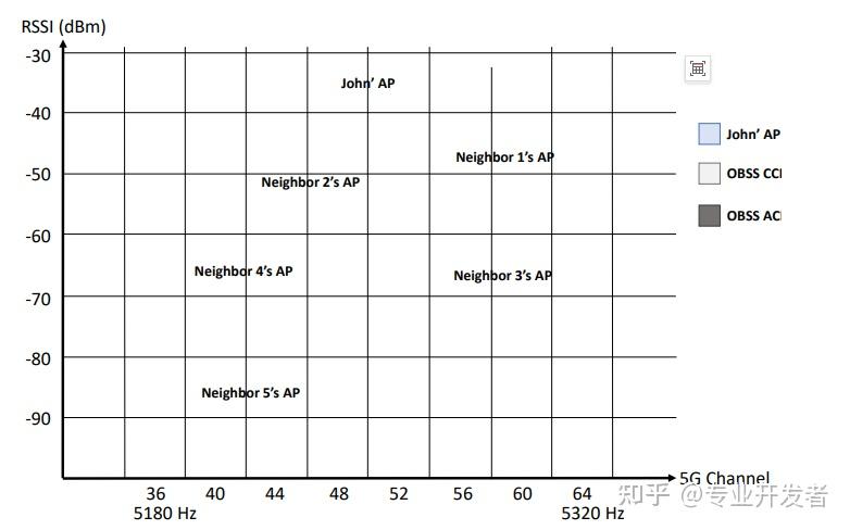 图 6 展示了 5GHz 信道(36 至 64)以及附近 Wi-Fi 网络的接收信号强度指示(RSSI)。约翰的 Wi-Fi 工作在 5GHz 频段,带宽 160MHz,主信道为 36。分析发现存在 6 个重叠的 Wi-Fi 网络(包括约翰的):两个相邻接入点 AP4 和 AP5 与约翰的 36 号信道重叠,造成同信道干扰(CCI);邻居接入点 AP1、AP2 和 AP3 部分共享频段,造成邻信道干扰(ACI)。在 2.4GHz 和 5GHz 频段资源有限的密集居民区,网络重叠与干扰十分常见。