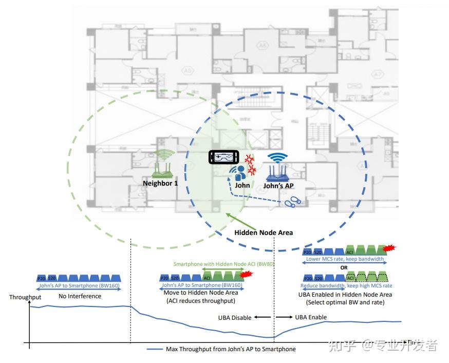 当隐藏节点的干扰状态未知时,UBA 会尝试各种带宽与速率的组合以有效避开干扰。通过持续发送短 PPDU,UBA 减少了测试开销,并能快速识别最优的带宽与速率组合,以在当前环境下实现最佳 Wi-Fi 速度。