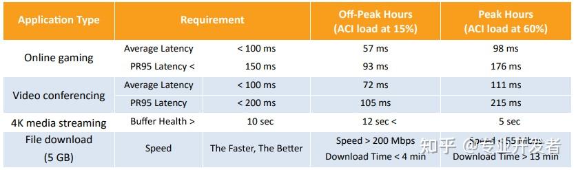 非高峰时段,所有应用的延迟和吞吐量均能稳定满足需求。但在高峰时段,性能下降明显:数据包错误率(PER)上升,吞吐量下降,延迟恶化。