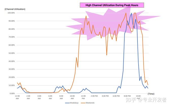 人们在选择 Wi-Fi AP 时,往往优先关注最大速率。在单 AP 网络场景中,约翰办理了 300Mbps 宽带,选择了入门级 Wi-Fi 7 AP(BE3600)。图 4 展示了约翰的 Wi-Fi 在工作日和周末无干扰时的信道利用率。高信道利用率意味着负载过重,可能导致拥塞、速率下降、延迟增加、服务中断和性能降低 ------ 这都是有限带宽竞争的结果。