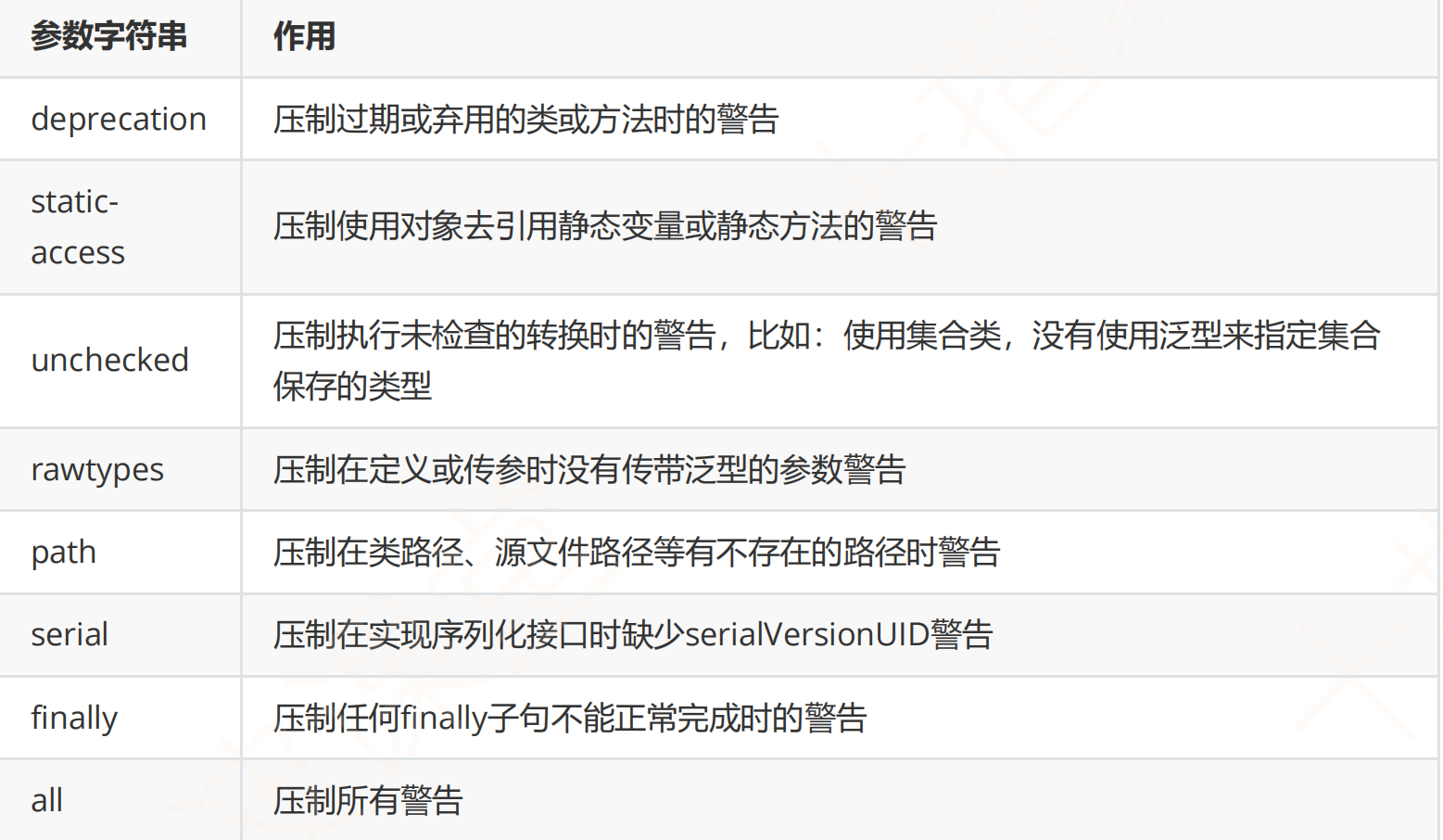 SuppressWarnings支持的参数如下,可以传入多个参数;