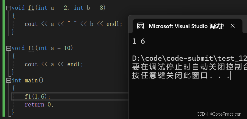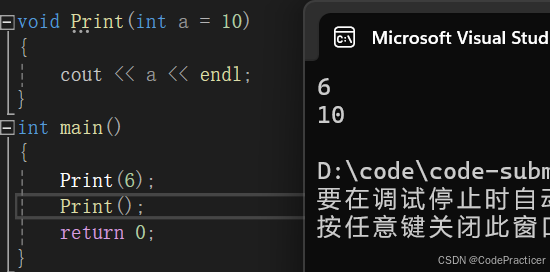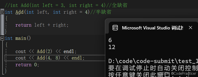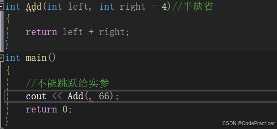 . 缺省参数分为全缺省和半缺省参数。(缺省参数也可以叫做默认参数 )全缺省 就是全部形参给缺省值 ,半缺省 就是部分形参给缺省值。C++规定,半缺省参数 必须从右往左依次连续缺省,不能间隔跳跃给缺省值。