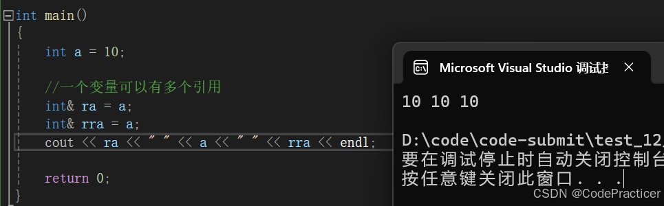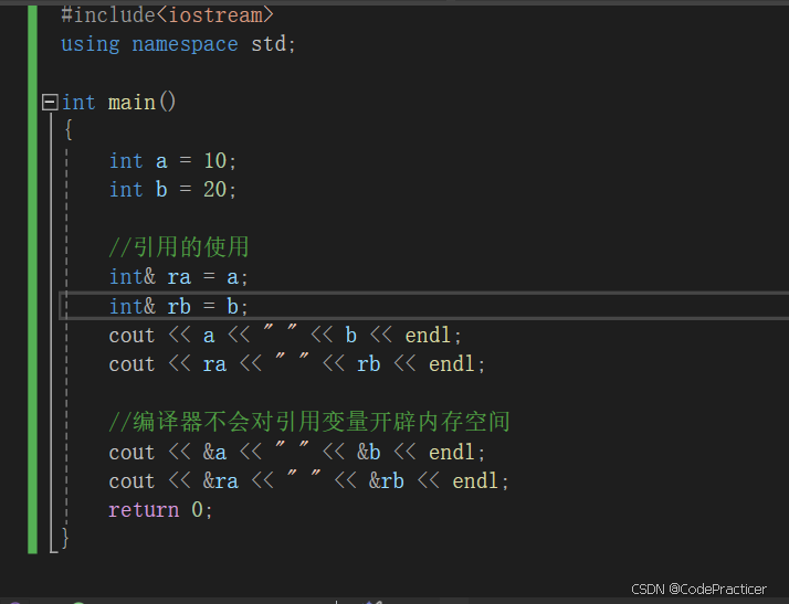 概念 :引用不是新定义一个变量,而是对已存在的变量取别名 ,编译器不会对引用变量开辟内存空间,它和它引用的变量共用同一块空间。