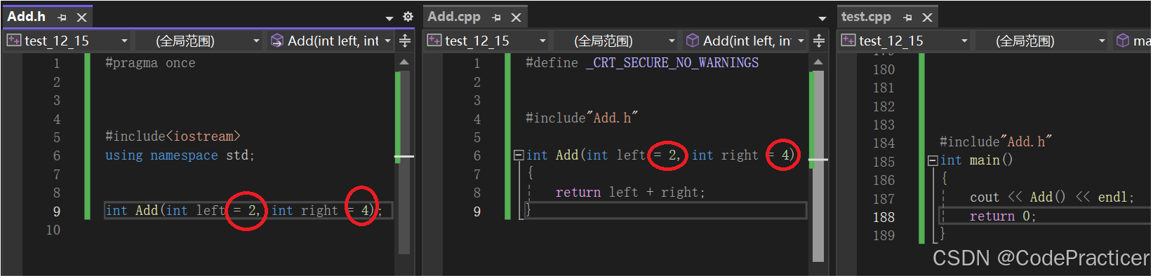 . 函数声明和定义分离时 ,缺省参数不能在函数声明和函数定义中同时出现,C++规定,必须在函数声明的地方给缺省值。