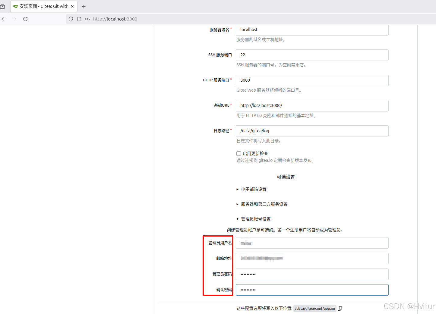 因为运行在docker上,所以实际路径是容器启动时挂载的路径:/service/docker/gitea/gitea/conf/app.ini