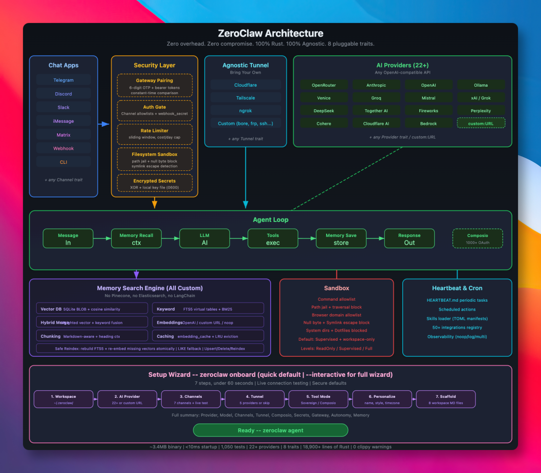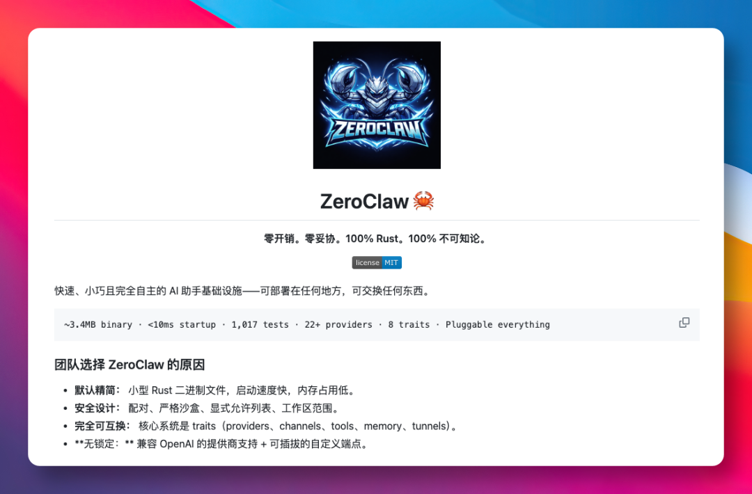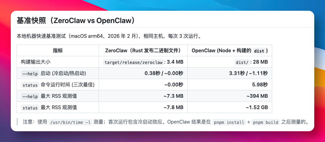 就在大家一边忍受风扇狂转,一边期待优化时,一个主打极速、轻量的 Rust 重构版:ZeroClaw,悄然开源。