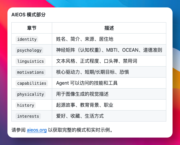简单来说,AIEOS 就是为了避免 AI 变成阅后即焚工具的一种规范,主打的就是让 AI 进化成一个有记忆、有性格、可成长的数字生命实体。