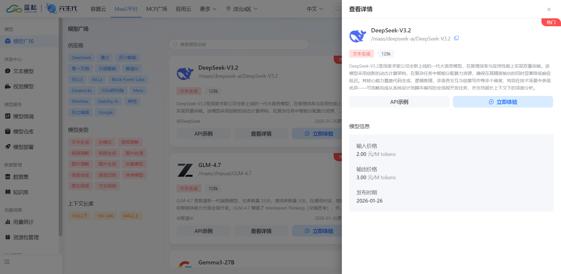 在模型广场中,选择 /maas/deepseek-ai/DeepSeek-V3.2。DeepSeek V3.2 在代码生成与逻辑推理任务上表现优异,非常契合本框架涉及的代码审计与运维指令生成场景。
