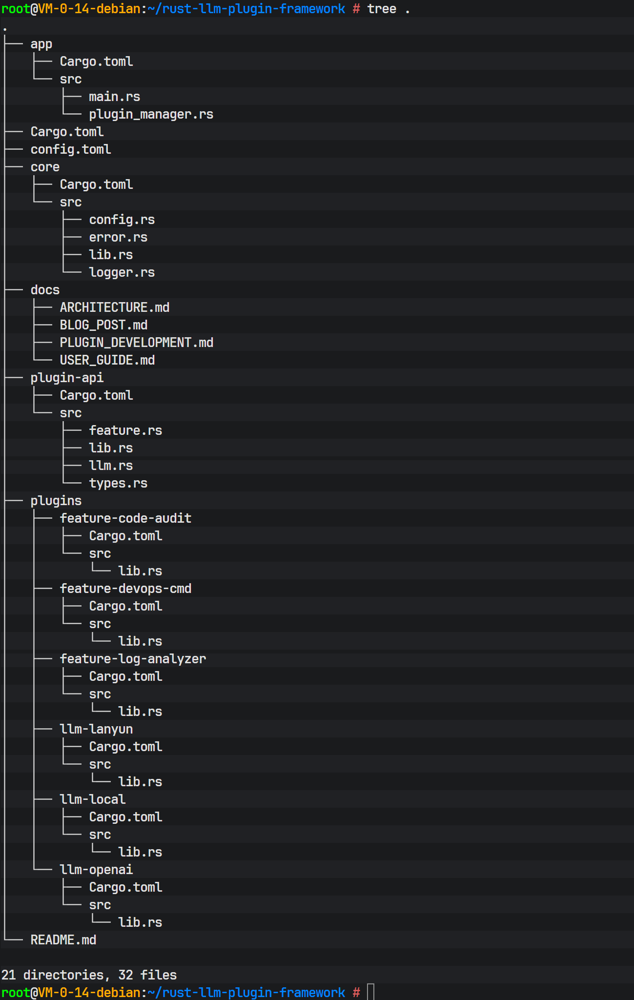 为了有效管理核心库、插件接口定义以及具体插件实现,本项目采用 Cargo Workspace 机制。Workspace 允许在同一个代码仓库中管理多个 Package,它们共享 Cargo.lock 文件与构建目录(target),极大地优化了编译速度与依赖管理。