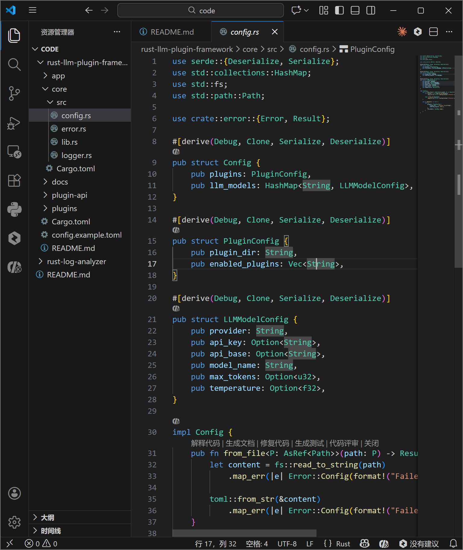 core 模块负责处理配置文件的反序列化。利用 serde 库的强大功能,可以将 TOML 文本直接映射为 Rust 结构体 Config。LLMModelConfig 结构体中使用了 Option 类型来处理可选参数,体现了 Rust 对空值安全处理的哲学。