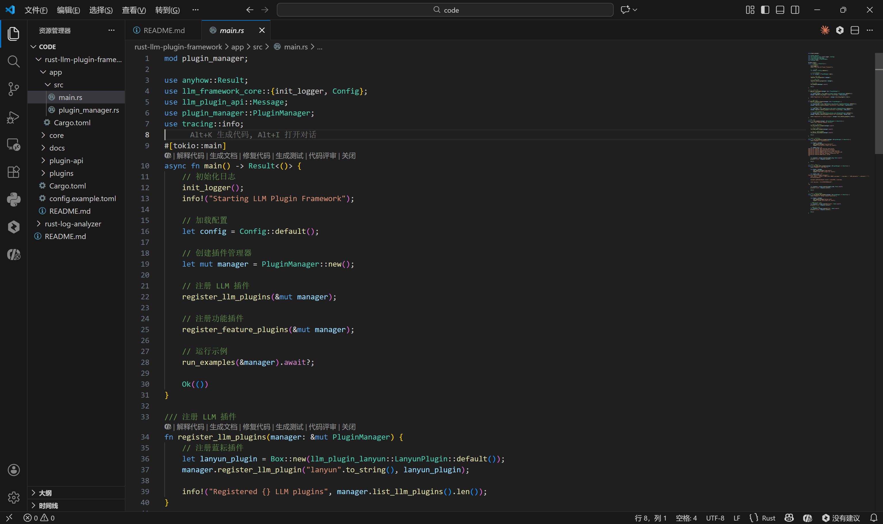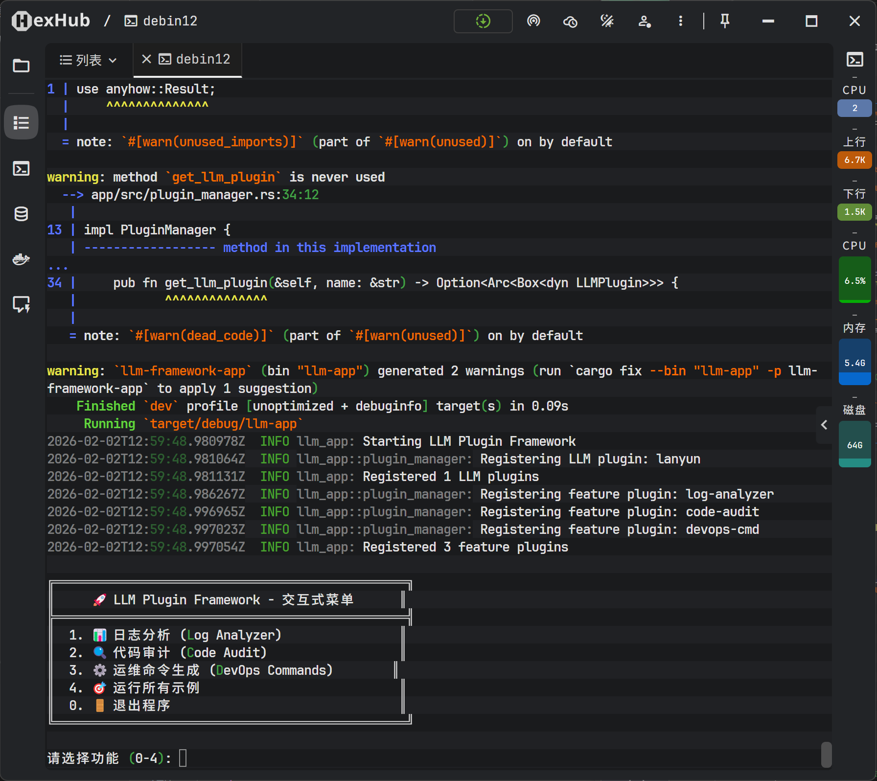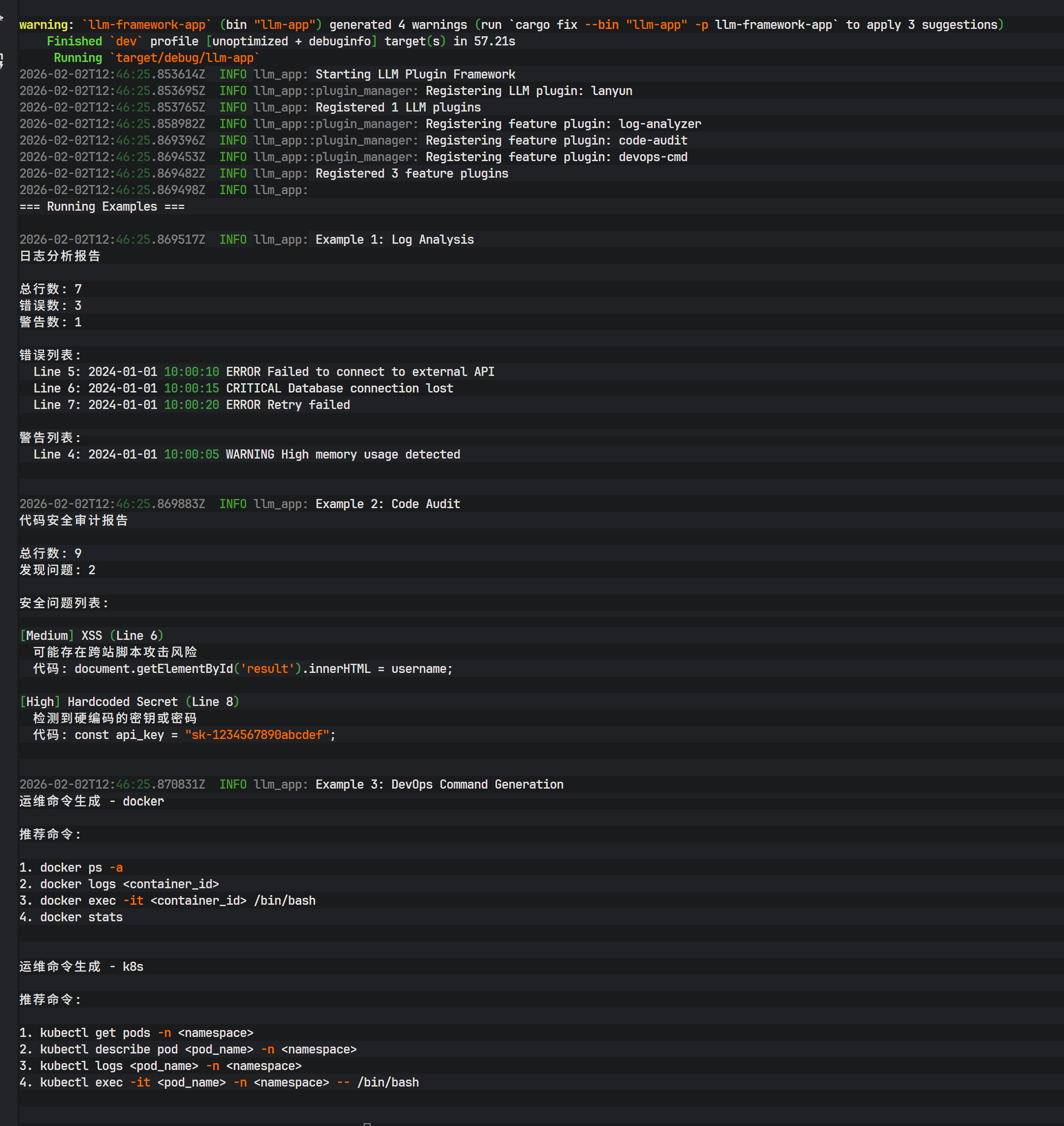 执行 cargo run --bin llm-app 启动应用。控制台输出展示了各个插件的执行结果。