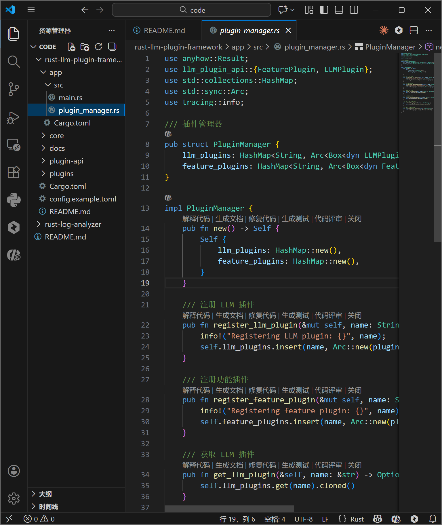 虽然文中未直接展示 plugin-api 的源码,但从 PluginManager 的实现可以推断出接口的设计。LLMPlugin 和 FeaturePlugin 是核心 Trait。