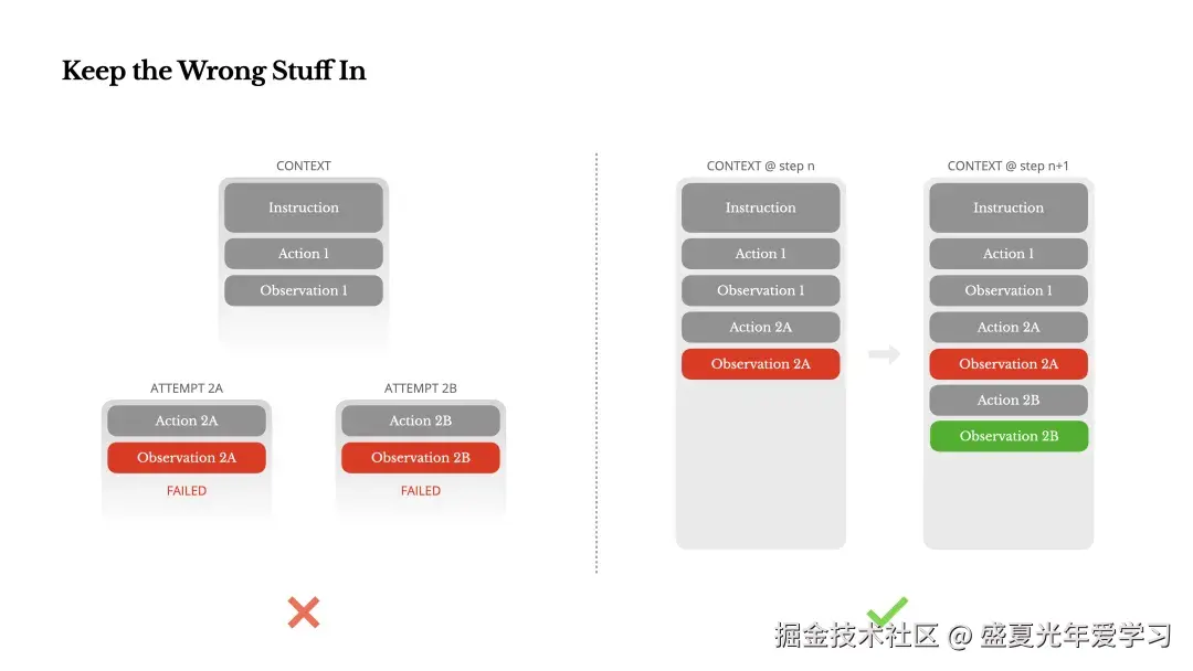 Manus 的解决方案是将错误的尝试保留在上下文中。当模型看到一个失败的行动------以及由此产生的观察结果或堆栈跟踪------它会隐式地更新其内部信念。这会改变其先验,降低重复相同错误的可能性。