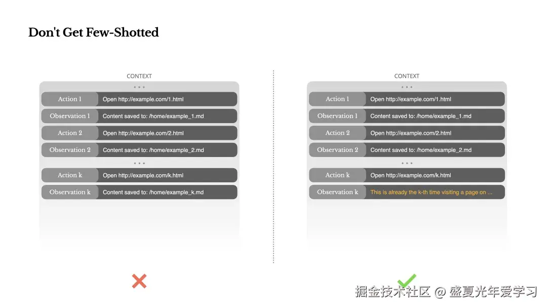 Few-Shot 是提高 LLM 输出的常用技术。但在 Agent 系统中,它可能会以微妙的方式适得其反。LLM 倾向于模仿上下文中的行为模式,容易导致偏离、过度泛化,或产生幻觉。