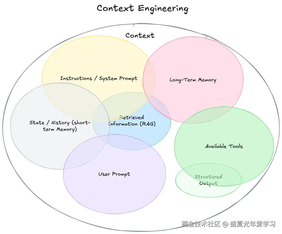 它不再将"上下文"视为单一的提示词,而是模型生成响应前所看到的一切信息:系统指令、对话历史、外部知识、可用工具、输出规范等。其核心是解决"在有限窗口内,如何填入最相关信息"这一根本矛盾。