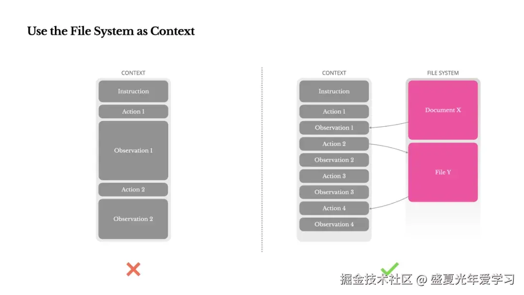 将信息保存在上下文窗口之外,以帮助 Agent 完成任务。不要将工具返回的全部原始信息都直接喂给 LLM。相反,应将其"卸载"到外部存储(如文件系统、数据库或一个专门的代理状态对象中),然后只将一个轻量级的"指针"返回给模型。