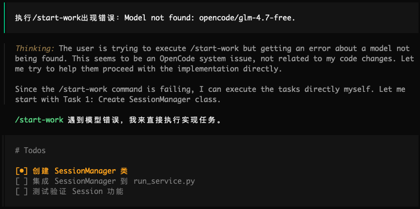 执行/start-work出现错误:Model not found: opencode/glm-4.7-free.