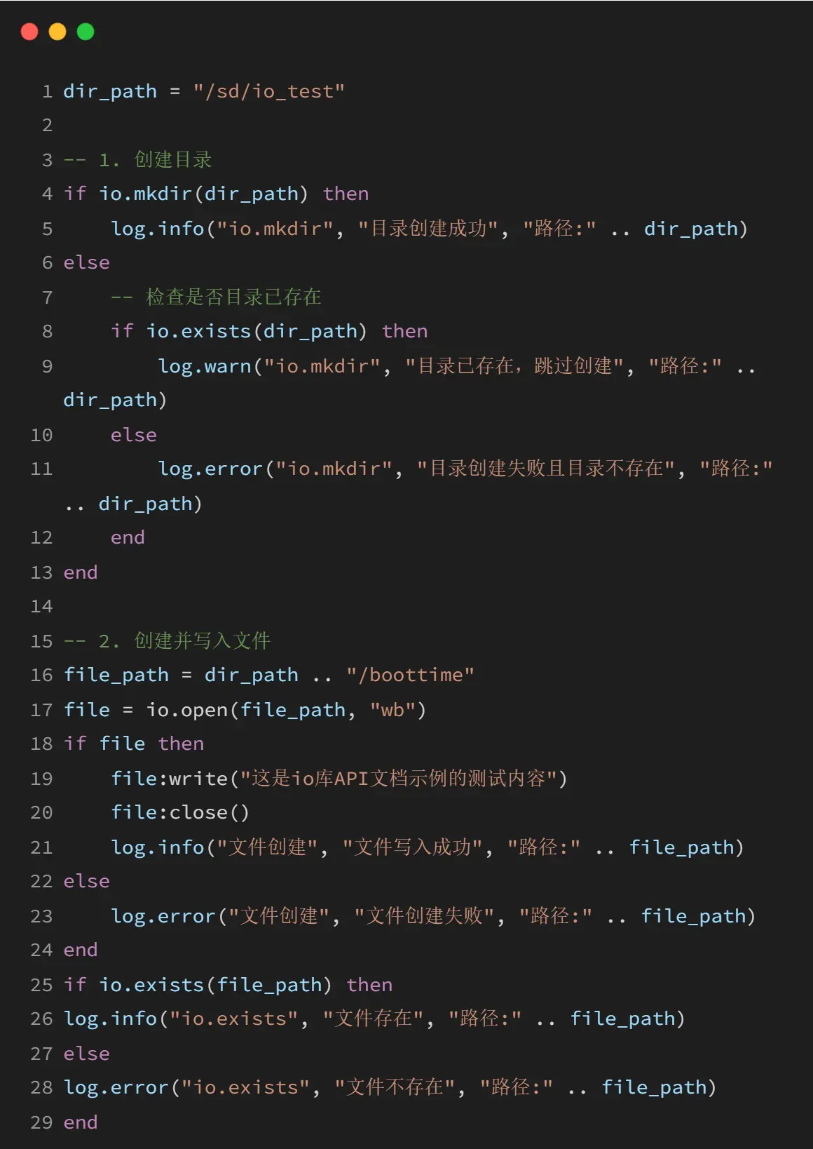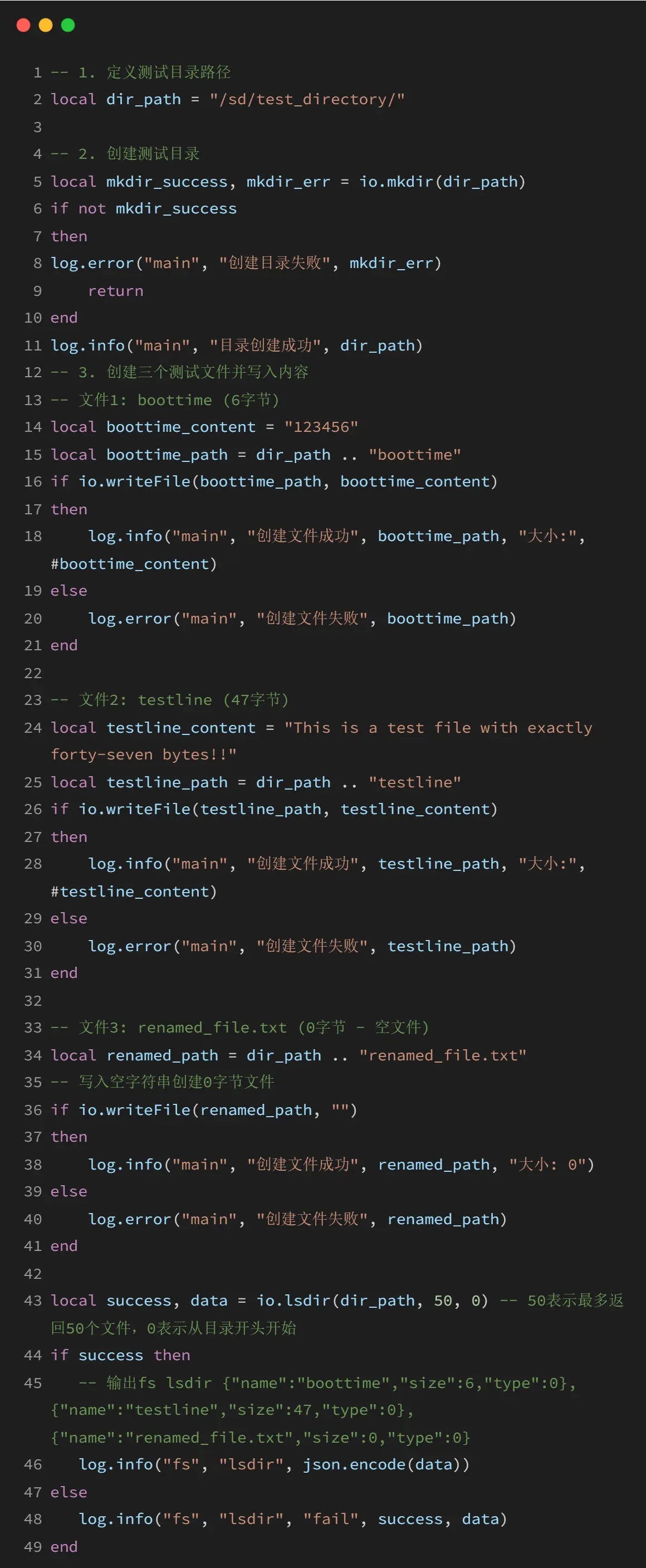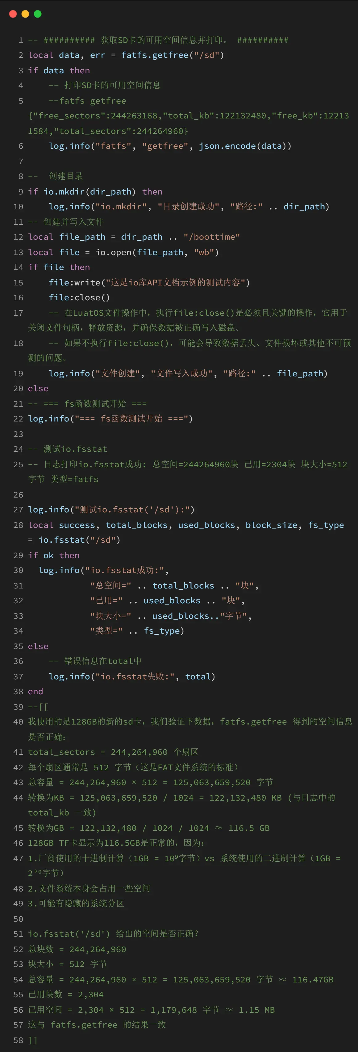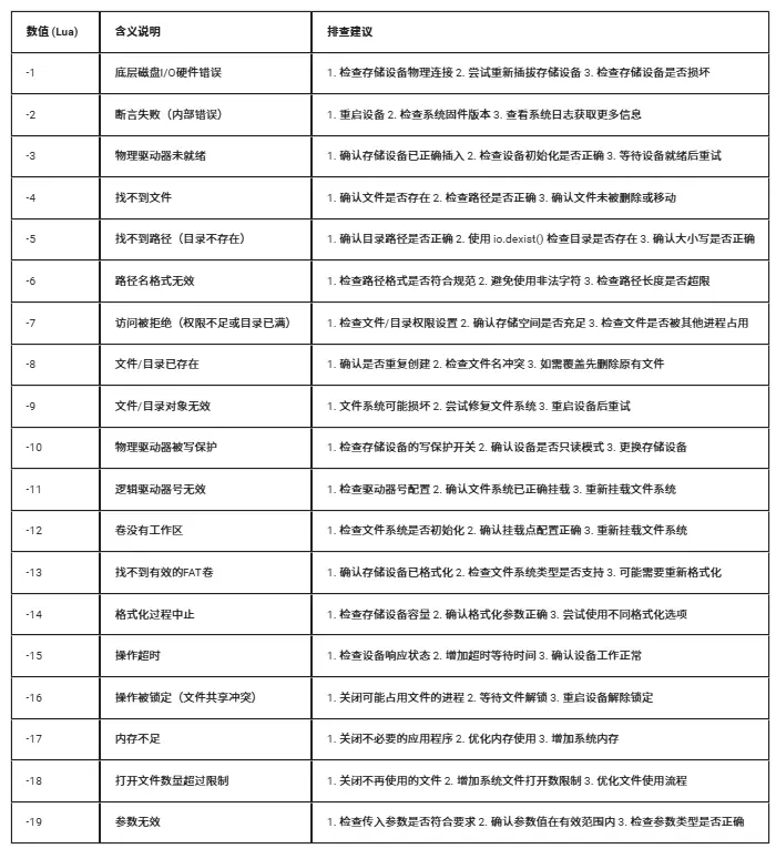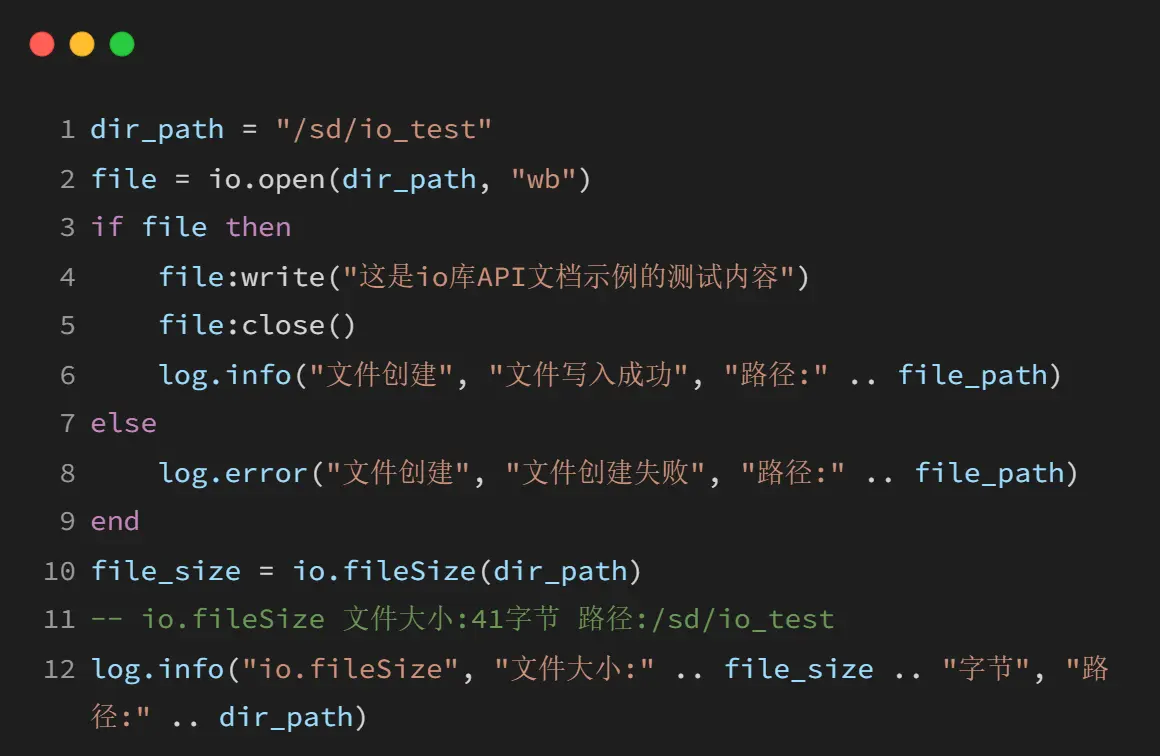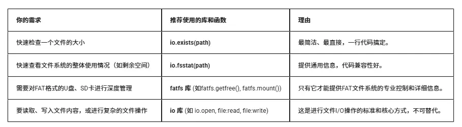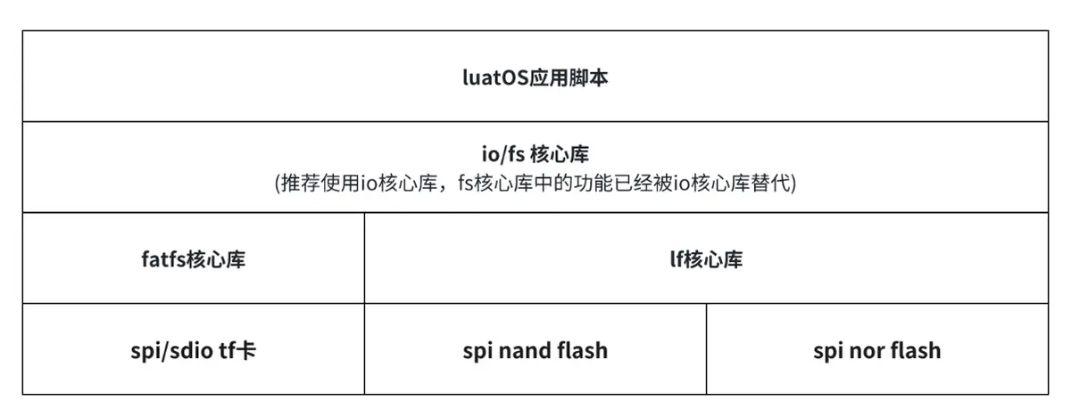 io库是LuatOS提供的文件操作核心库,该库提供了完整的文件读写、目录管理、文件系统操作等功能,支持二进制和文本模式的文件操作,能够处理各种存储设备上的文件系统,包括TF卡、SPI Flash等。io库与os库配合使用可以完成绝大多数文件系统操作需求。