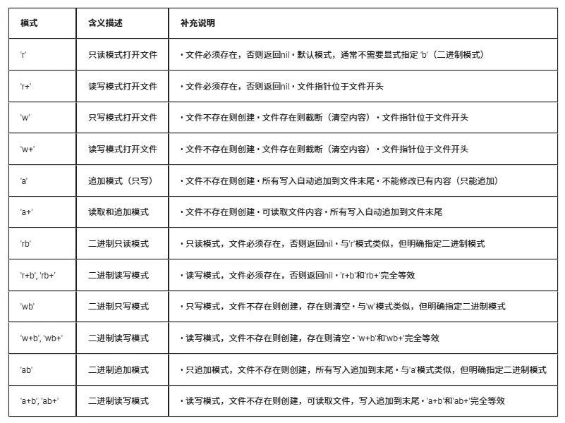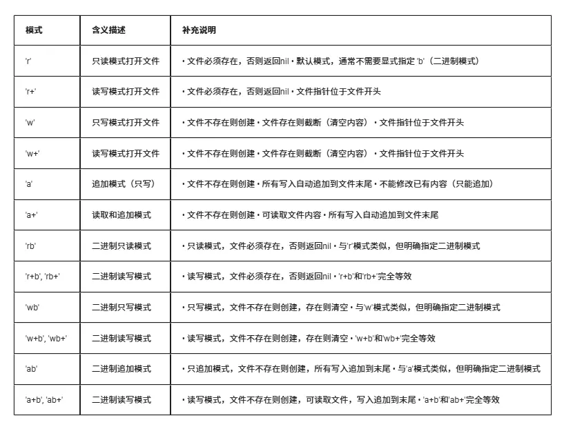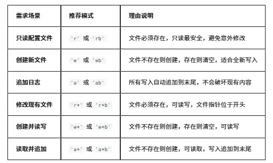 在LuatOS文件操作中,选择合适的文件打开模式至关重要,这直接影响文件操作的安全性、效率和功能。以下是各种模式的适用场景和推荐用法: