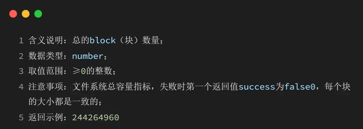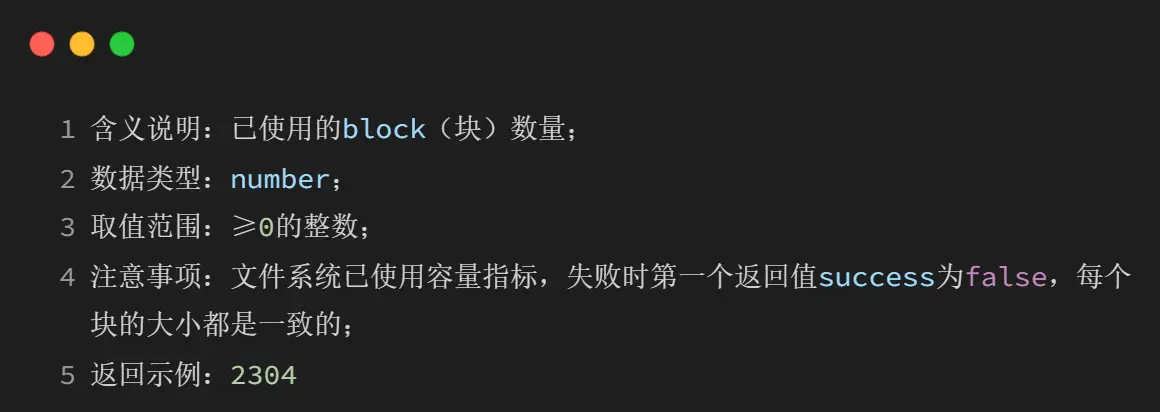 io.fsstat 返回的"总空间"和"已用空间"值表示的是块的数量这些都是整数。