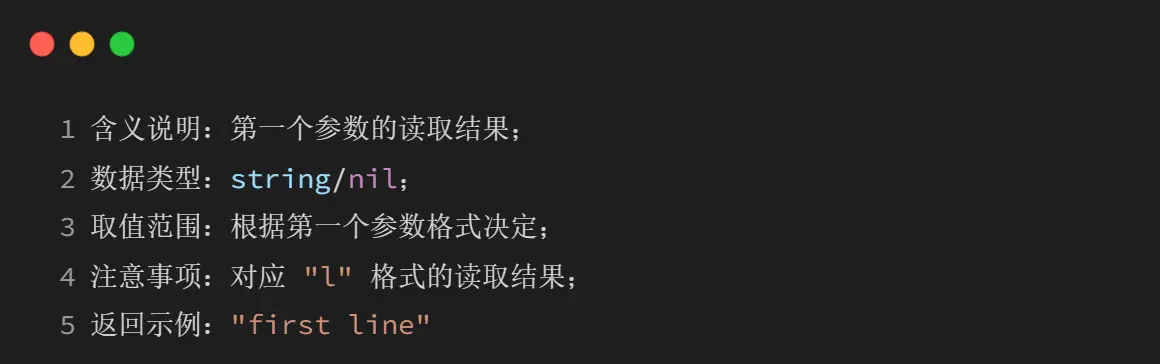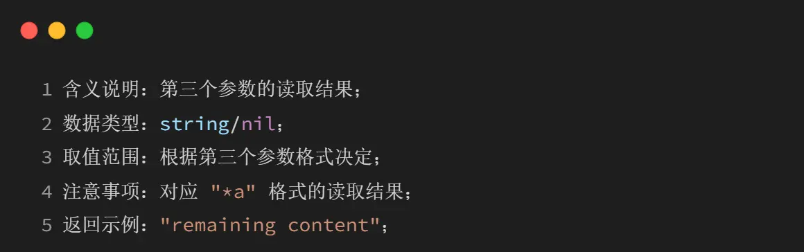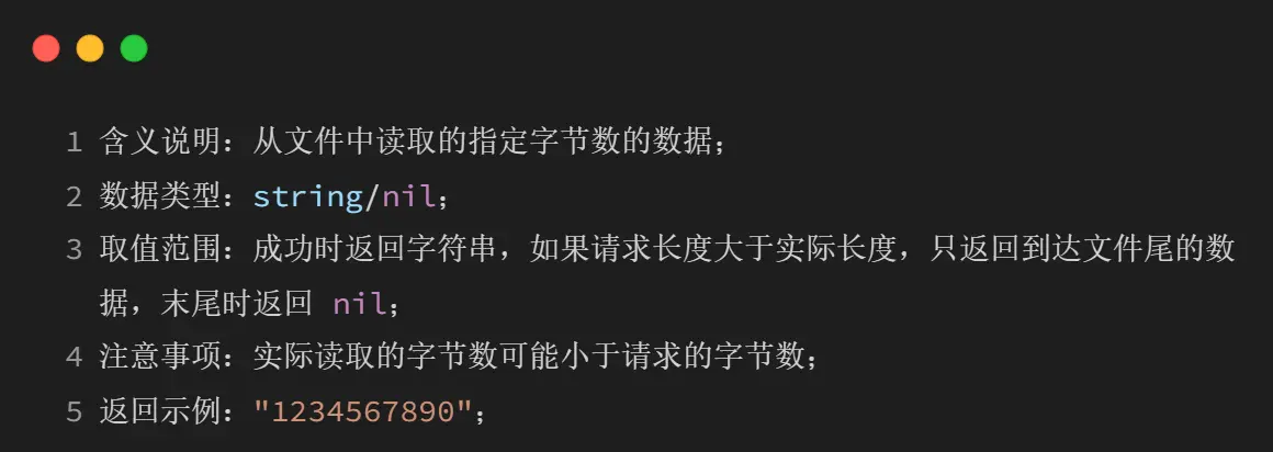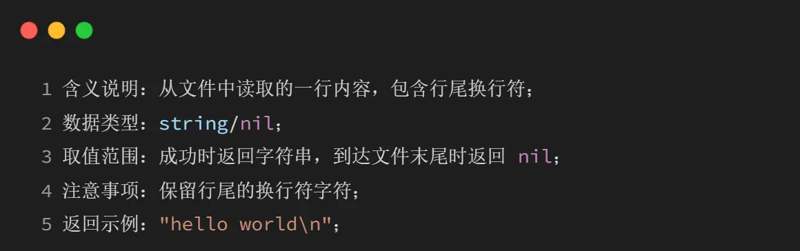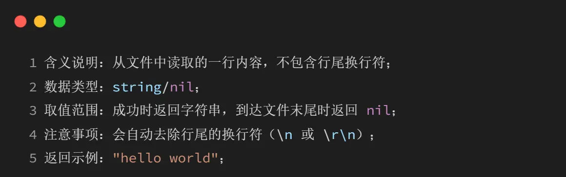 3、结束条件:当读取到文件末尾时,后续返回值均为 nil